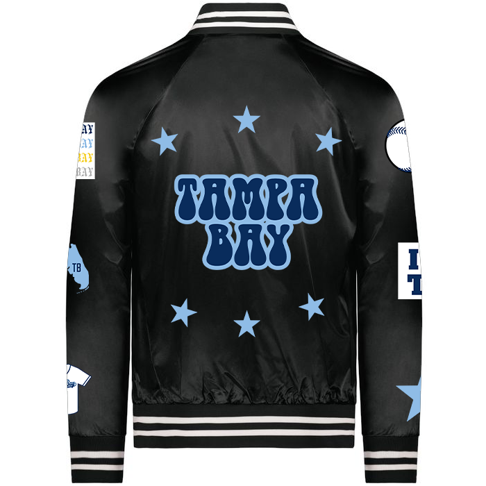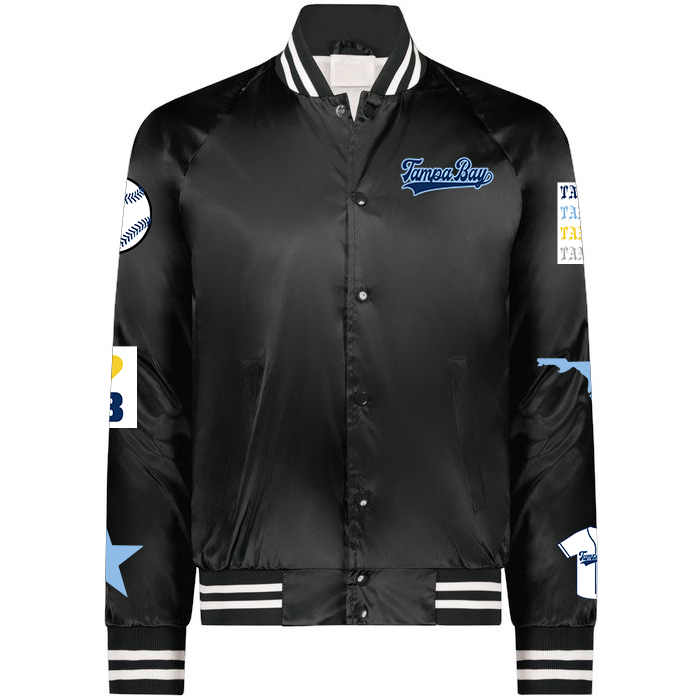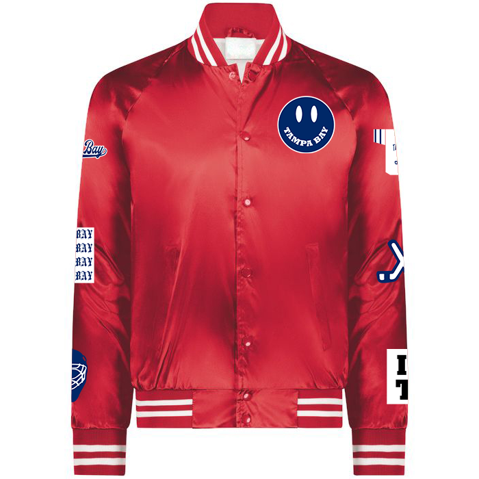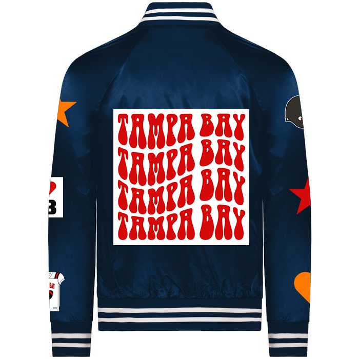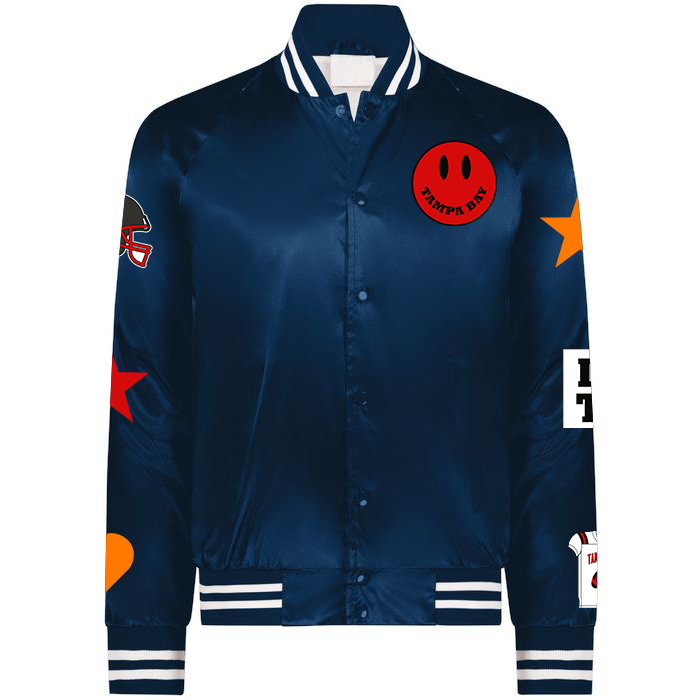 Turn up the heat with this customizable satin bomber, available in bold Red, deep Navy, or sleek Black. Designed with varsity details and loaded with Florida flair, this jacket lets you stack sewn-on patches that shout out your Tampa Bay pride - without saying a word.