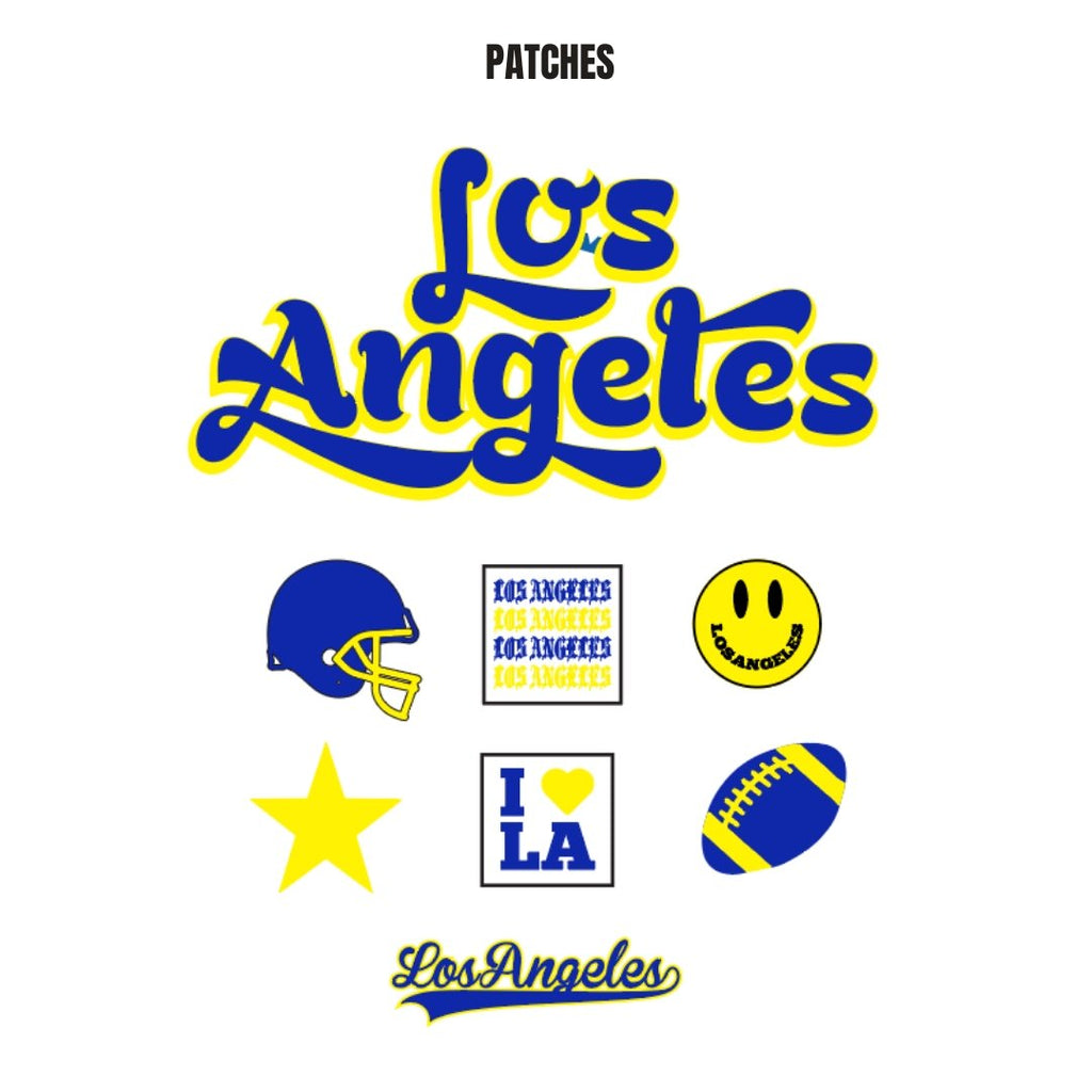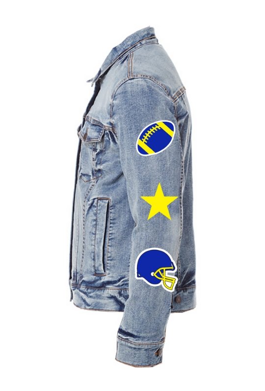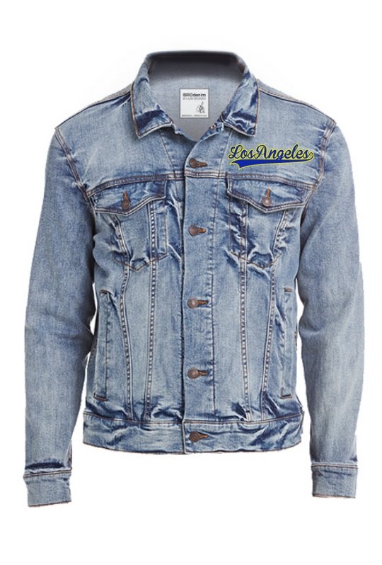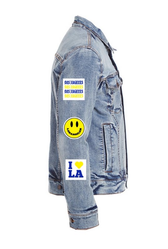 Los Angeles Denim Jacket with custom sewn patches. Denim is true to size