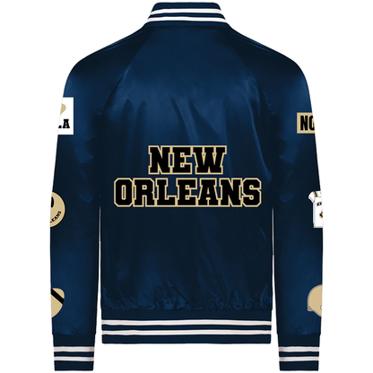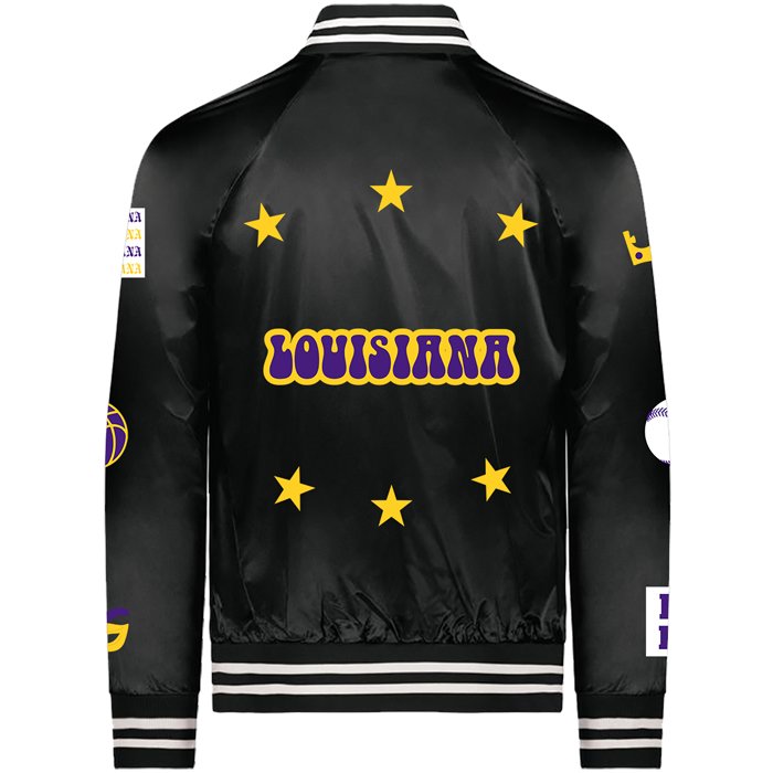 Bold, festive, and full of flair, just like Louisiana itself. The customizable Louisiana Bomber is available in black, navy, or gold, and pairs perfectly with your choice of sewn-on patches inspired by bayou culture, Mardi Gras energy, and Southern sports spirit.